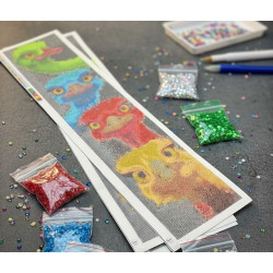 Featuring four feathered friends stacked vertically, each bird pops in a different bold hue—electric green, brilliant blue, fire-engine red, and sunny yellow. Their large, expressive eyes and slightly sassy expressions make this a truly delightful and eye-catching piece of art.
