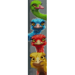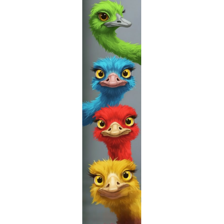 Design: Four colourful, whimsical ostriches stacked vertically.